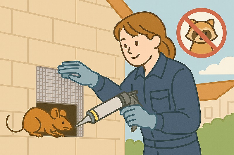- 小さな隙間 → 防獣パテ・コーキング材で塞ぐ